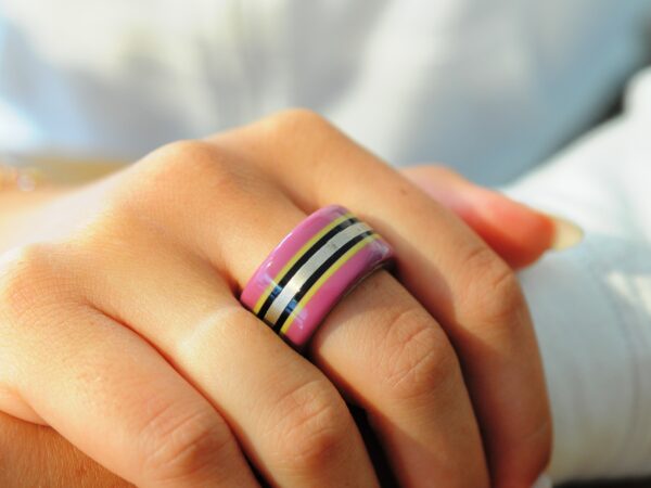 Farbenfroher breiter Acetatring mit einer Ringschiene aus 925 Silber. Der an der Ringschiene fest angebrachte „Mittelstreifen“ besteht ebenfalls aus Silber. Links und rechts des Mittelstreifens ist entsprechend das Acetat aufgebracht. Dieser Damenring mit Acetat ist ein Unikatschmuckstück und auch nur in der hier angegebenen Ringgröße erhältlich.