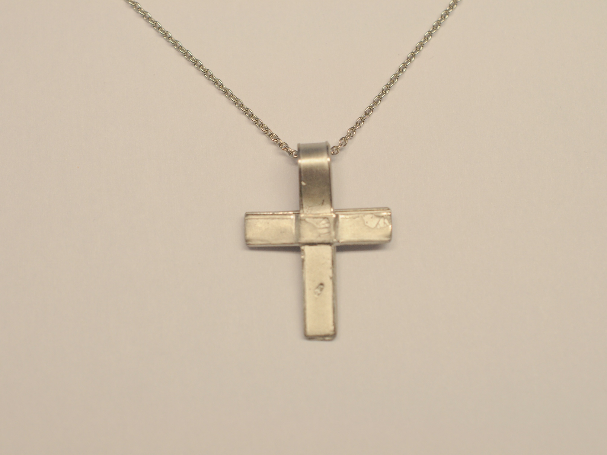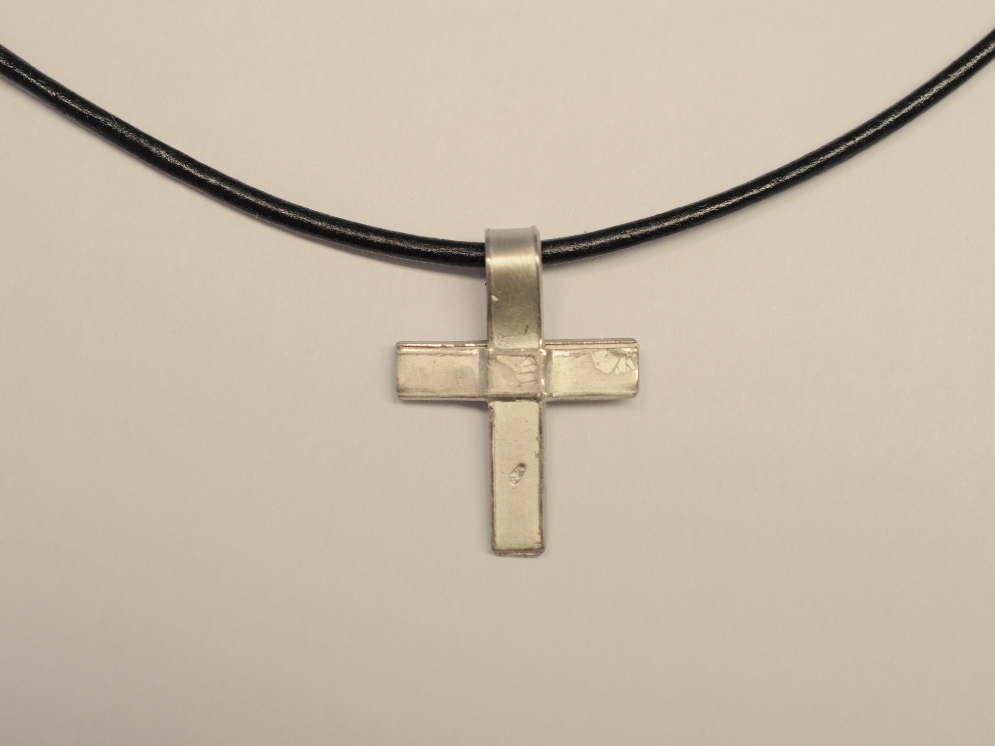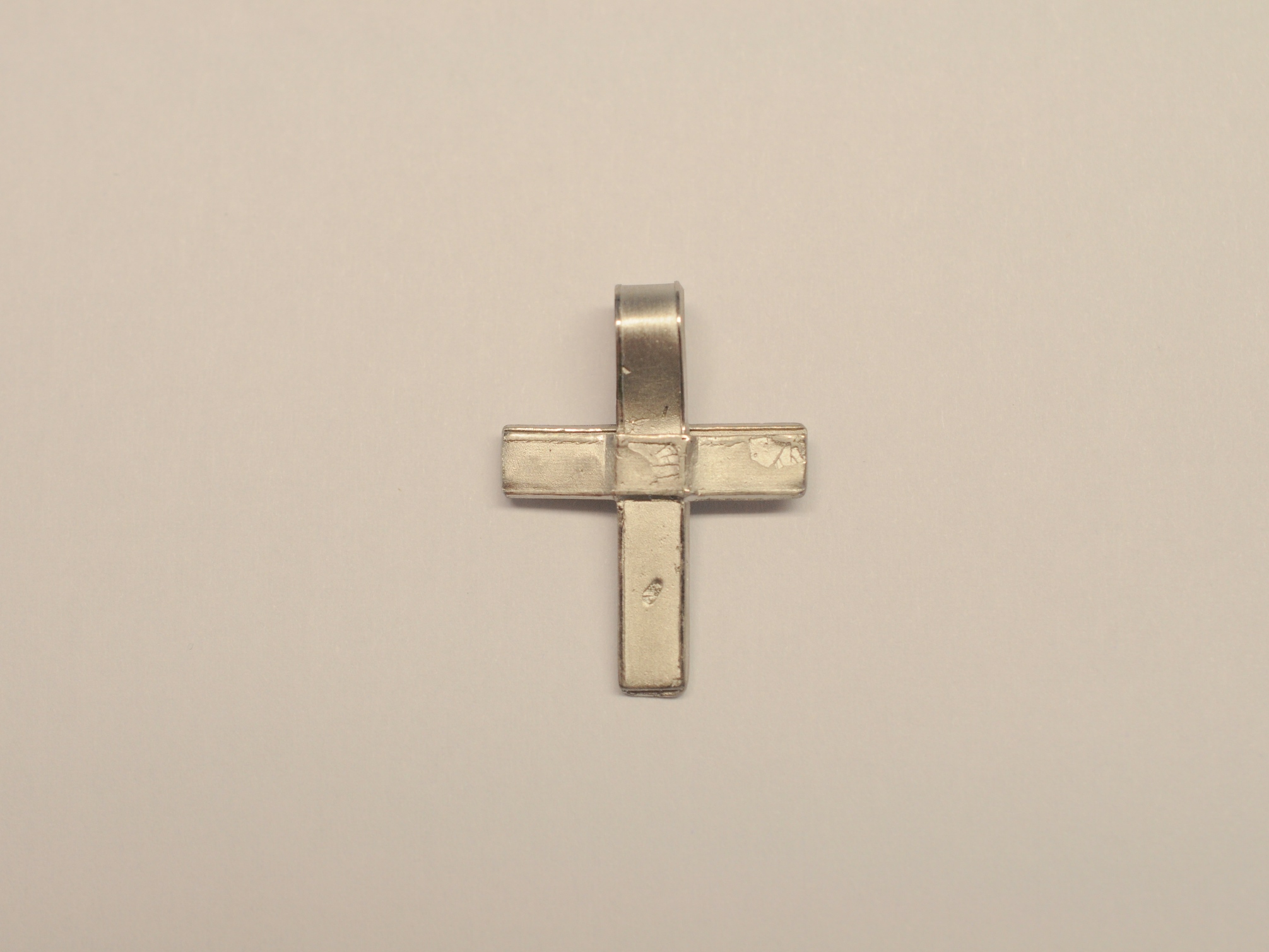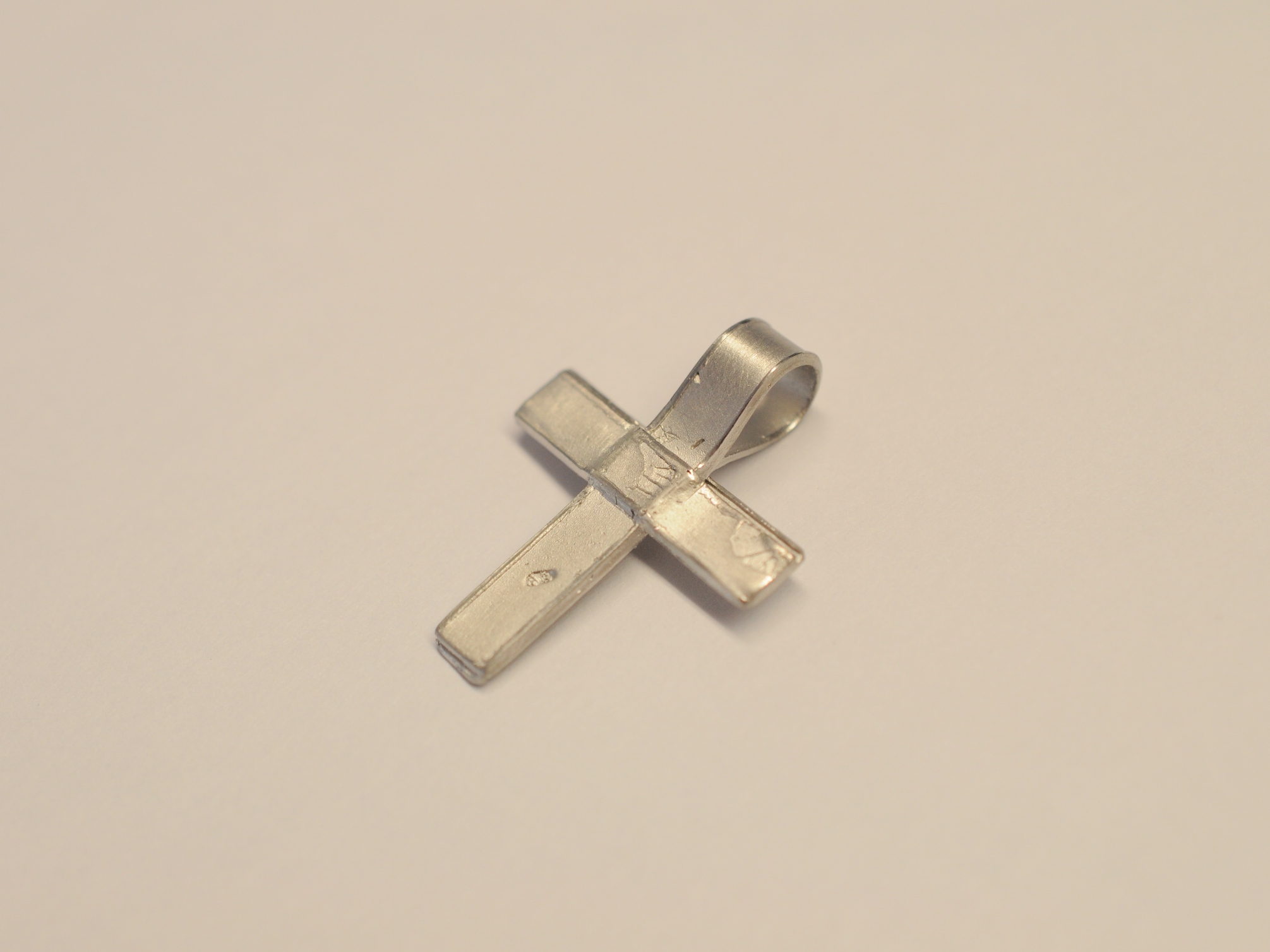 Das Kreuz habe ich aus Wachsbändern modelliert und anschließend in 950 Platin gegossen. Es handelt sich bei dem Anhänger um ein Unikatkreuz, wobei keine Form angefertigt wurde. Das Kreuz besticht durch eine antik wirkende Oberfläche mit beabsichtigten Guss-Strukturen, sogenannten Lunkern. Einfach schön und eben anders als industriell gefertigte Kreuzanhänger.