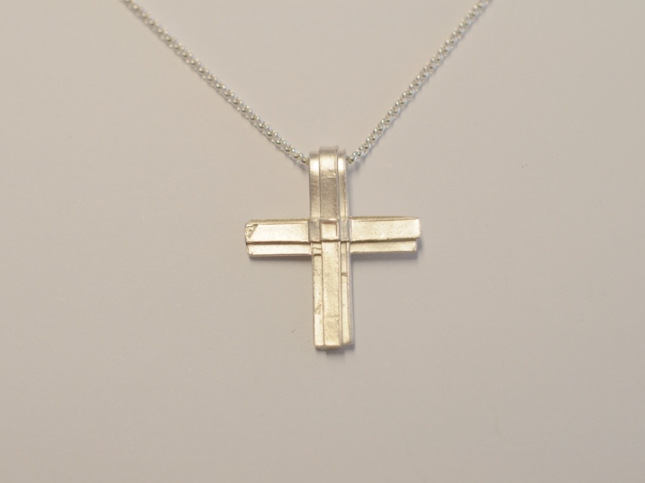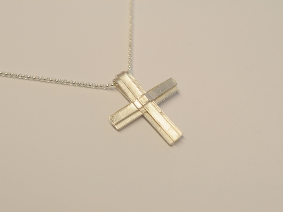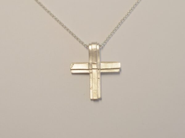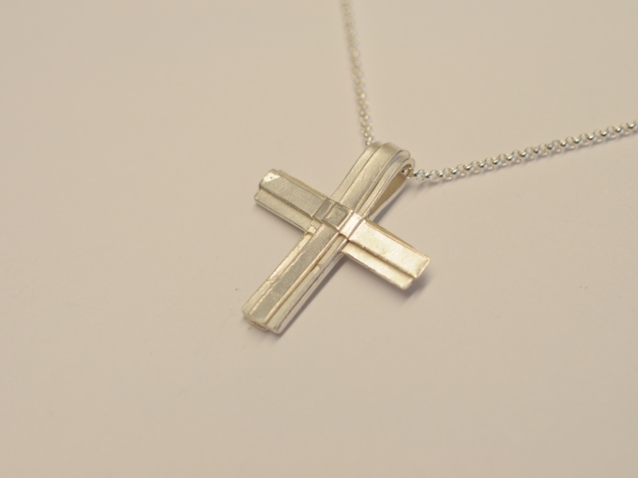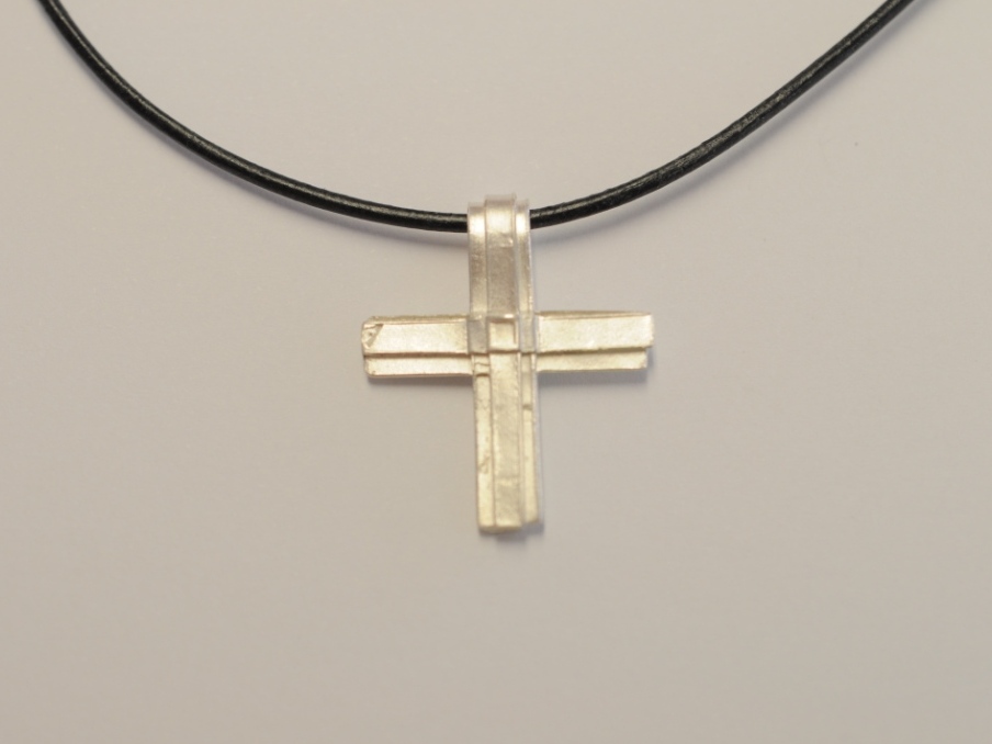 Das Kreuz ist aus Wachsbändern modelliert und in 925 Sterling Silber gegossen. Es handelt sich bei dem Anhänger um Unikatschmuck, wobei keine Form angefertigt wurde. Das Kreuz besticht durch seine antik wirkende Oberfläche mit beabsichtigten Guss-Strukturen, sogenannten Lunkern.