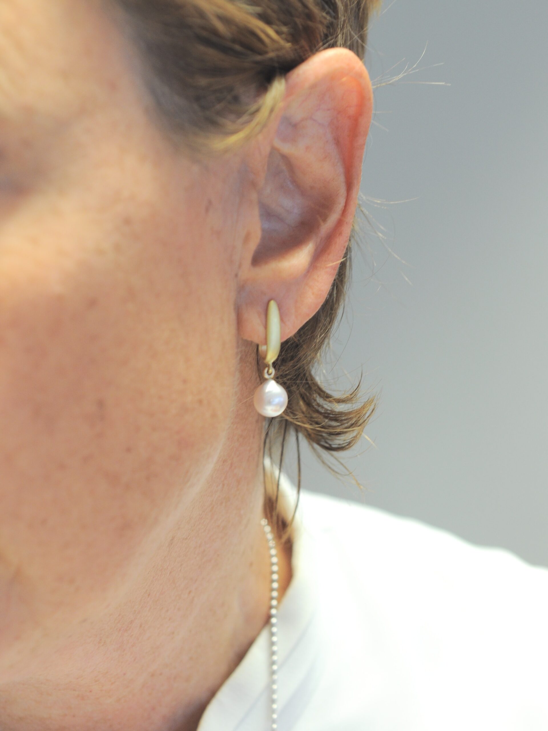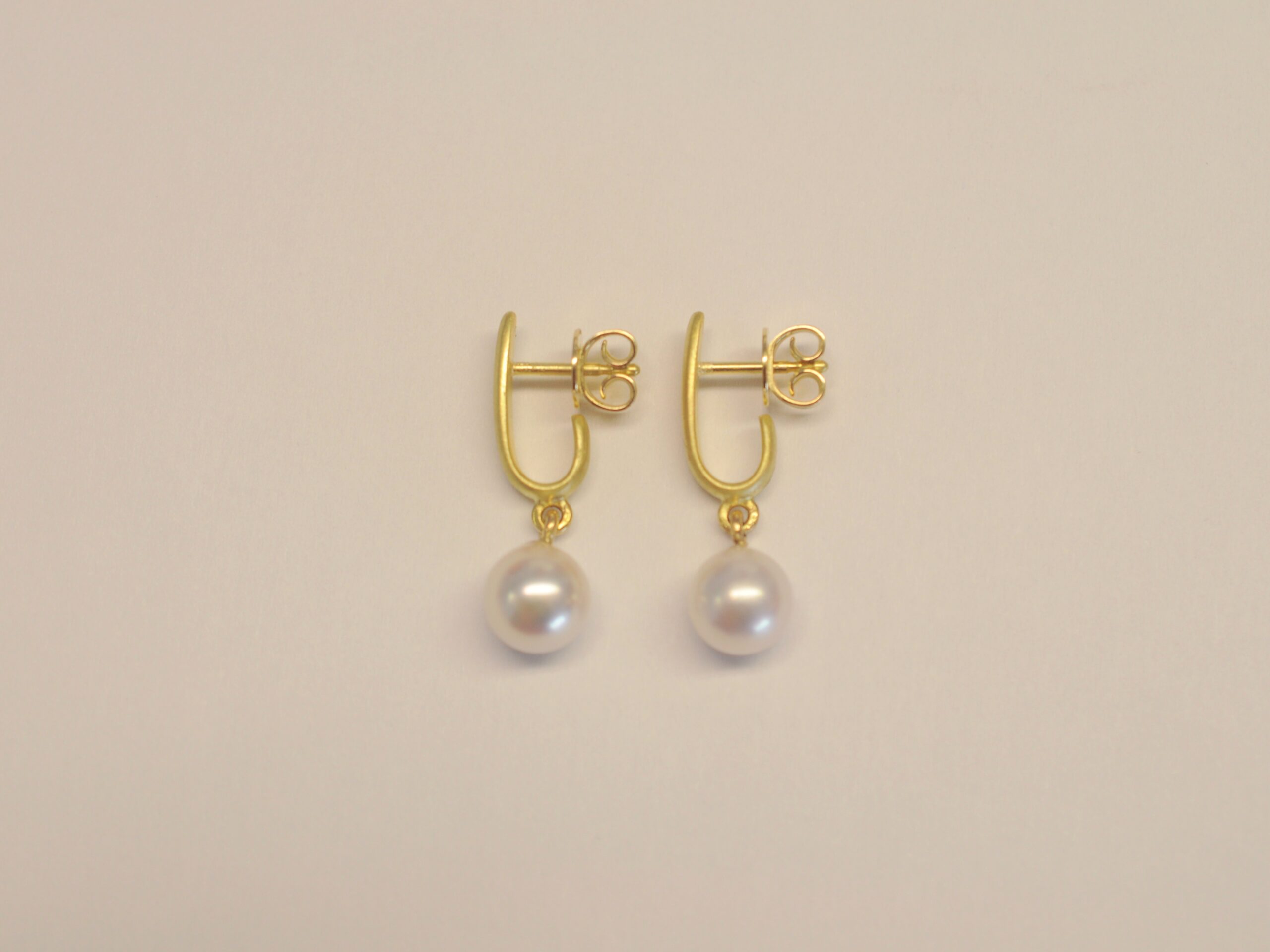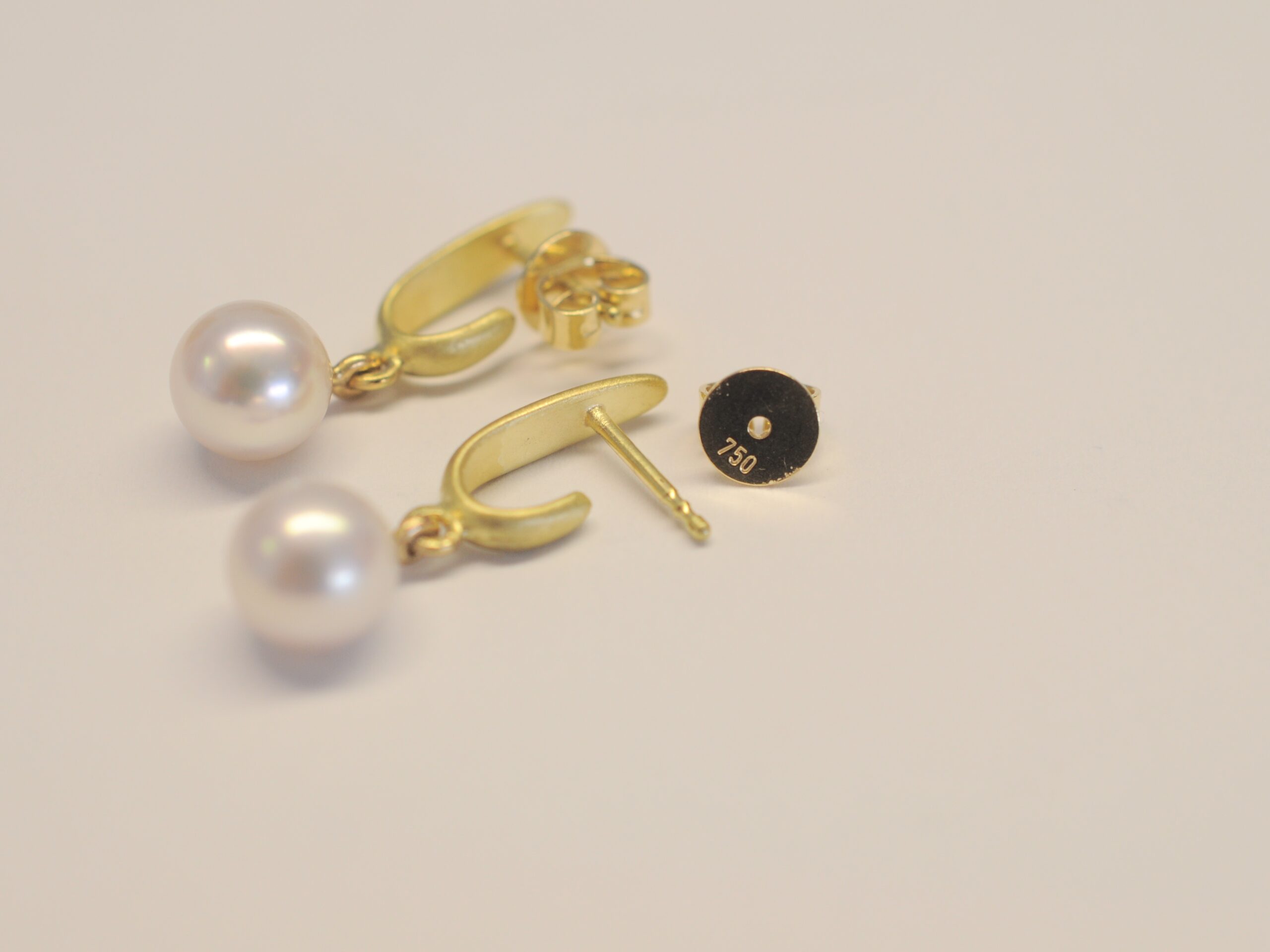 Bezauberndes und sehr hochwertiges Paar Ohrhänger mit Akoya-Perltropfen. Die Ohrhänger sind aus 750 Gelbgold hergestellt und haben einen Steckverschluss. Die Oberfläche ist mattiert. Bei den Perlen handelt es sich um japanische Akoya-Perlen. Die leicht tropfenförmigen Perlen haben einen Durchmesser von 7,3 bis 7,9 mm.
