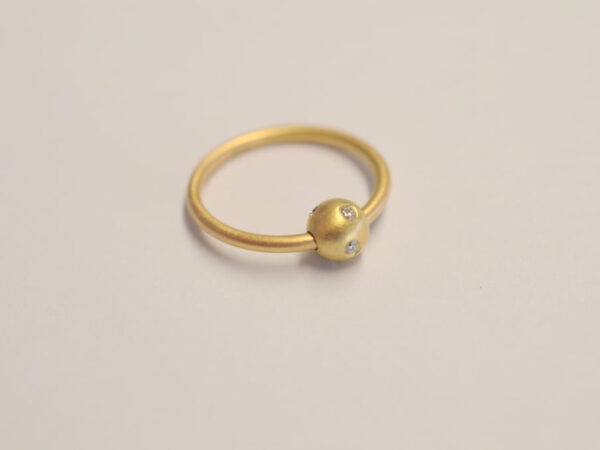 Damenring unserer „Sternenhimmel Kollektion“ bei dem eine frei bewegliche Kugel aus Gelbgold die Ringschiene „umkreist“. Die Kugel ist asymmetrisch mit fünf Diamanten im Brillantschliff besetzt. Der besondere und hochwertige Ring ist aus 750 Gelbgold (18 Karat) gearbeitet.