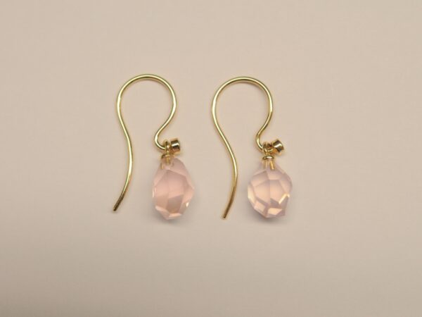 Der Rosenquarz Steine besitzen einen sogenannten Klunker-Cut. Die Größe der rosafarbenen Rosenquarze beträgt 11 * 8 mm (Höhe * Breite) bei ca. 8,42 ct. An der Oberseite jedes Rosenquarzes befindet sich eine kleine Gelbgold Öse, in welche die Wechselbügel aus 750 Gelbgold eingehängt werden können.
