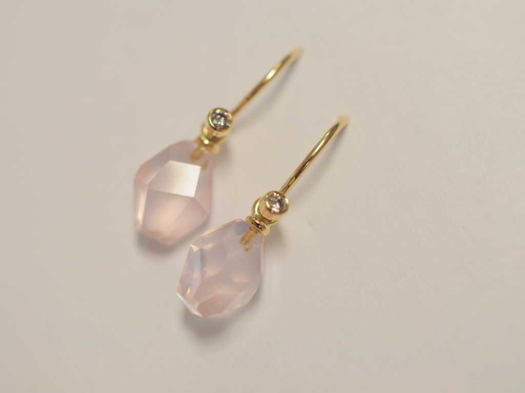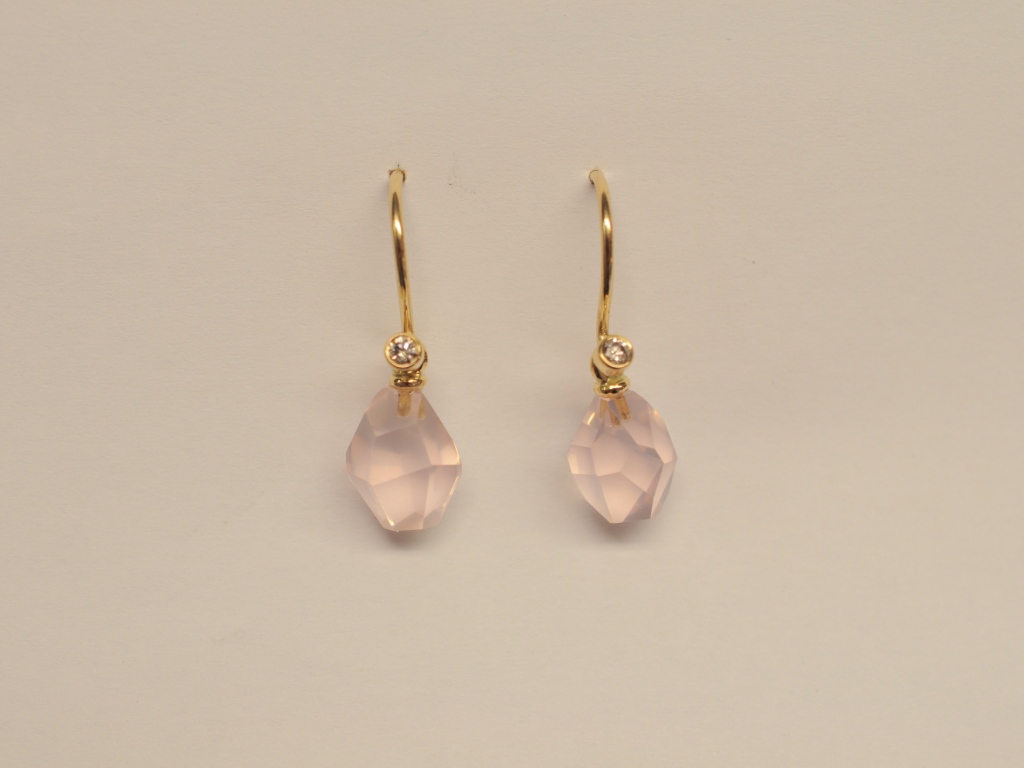 Wunderschönes und sehr hochwertiges Paar Ohrringe (Ohrhänger) aus 750 Gelbgold mit Rosenquarz. Dieses paar Ohrhänger ist jeweils zweiteilig! Die Rosenquarze hängen an einem Wechselbügel aus 750 Gelbgold. Dieser handgefertigte Wechselbügel besitzt am Ende als Abschluss einen Diamanten im Brillantschliff!