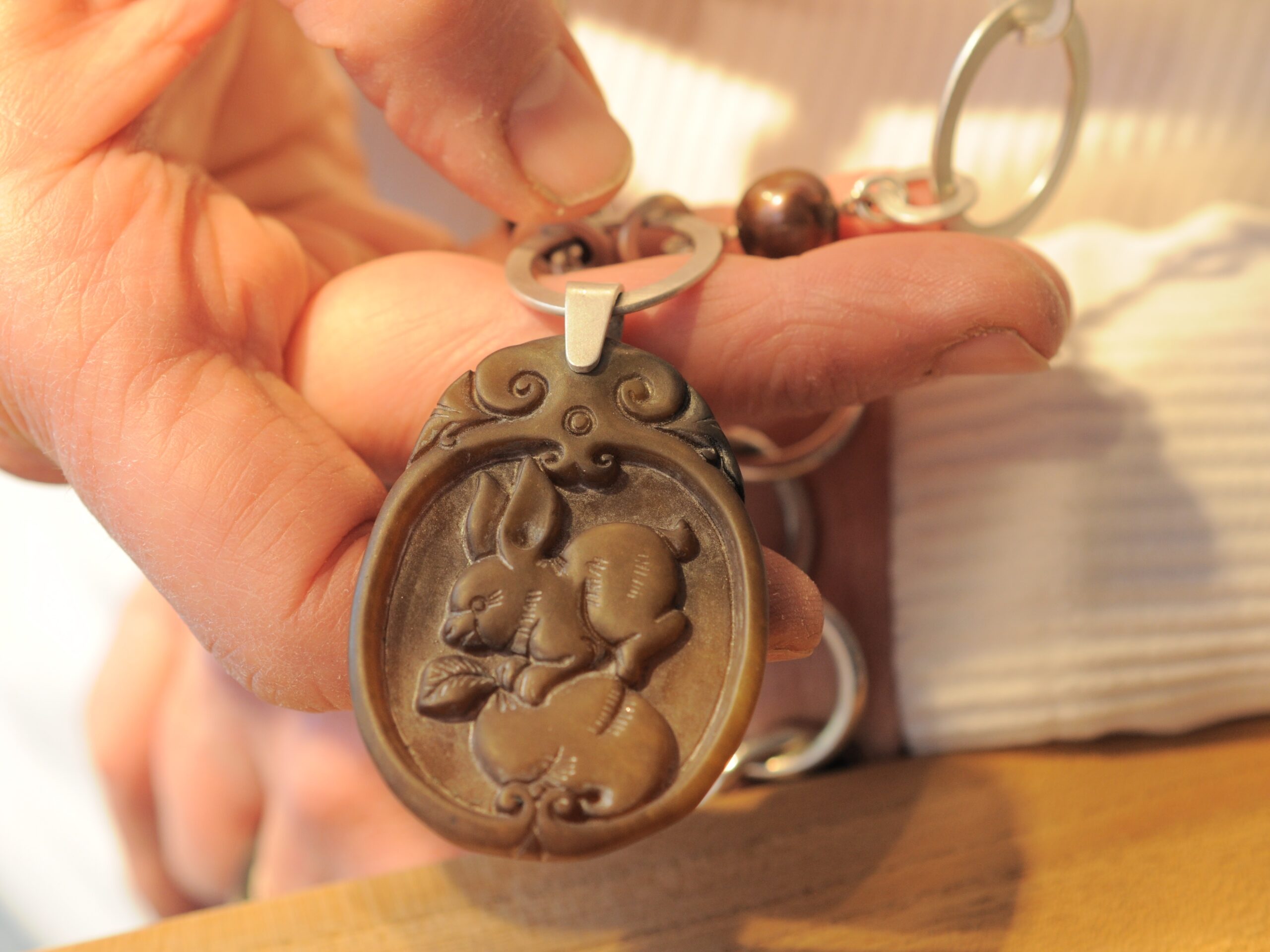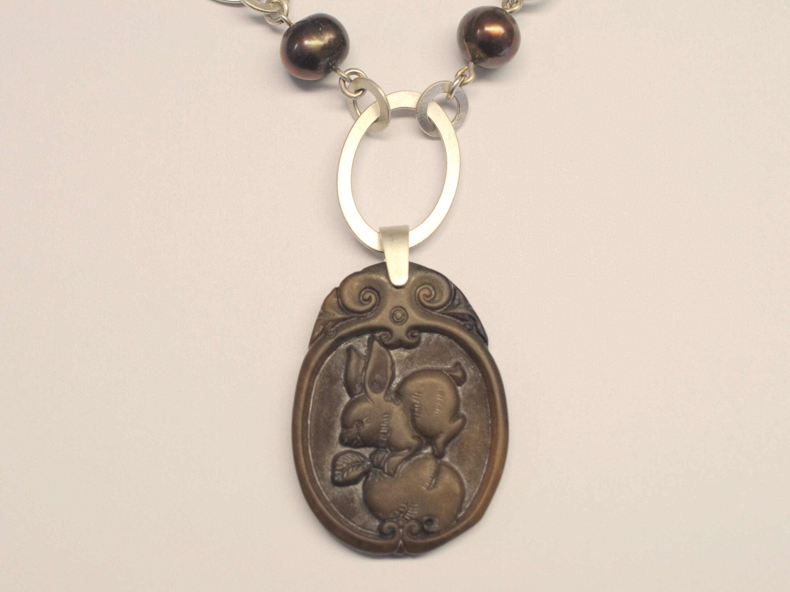 An unteren Ende der Kette befindet sich ein brauner Jade Anhänger mit einem von Hand geschnitztem Hasenmotiv. Der ovale Jadeanhänger mit Silberaufhängung hat eine Größe von ca. 49 cm * 36 cm. Das Gesamtgewicht der Halskette beträgt 85 g.