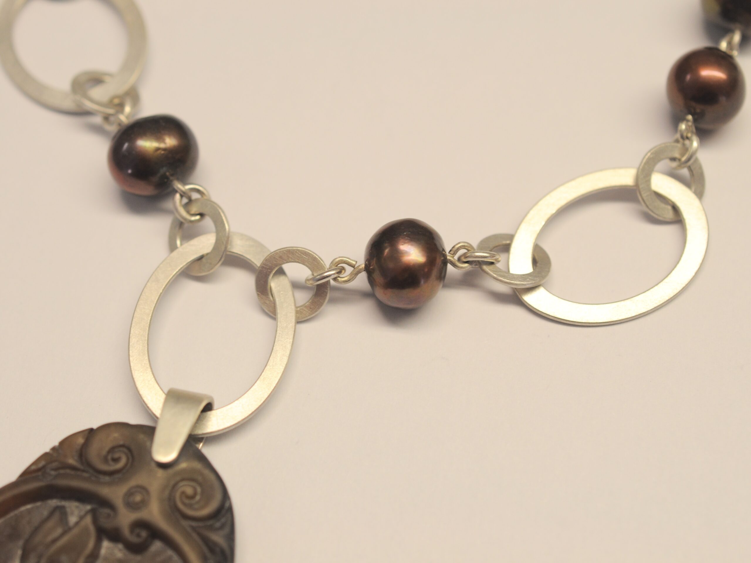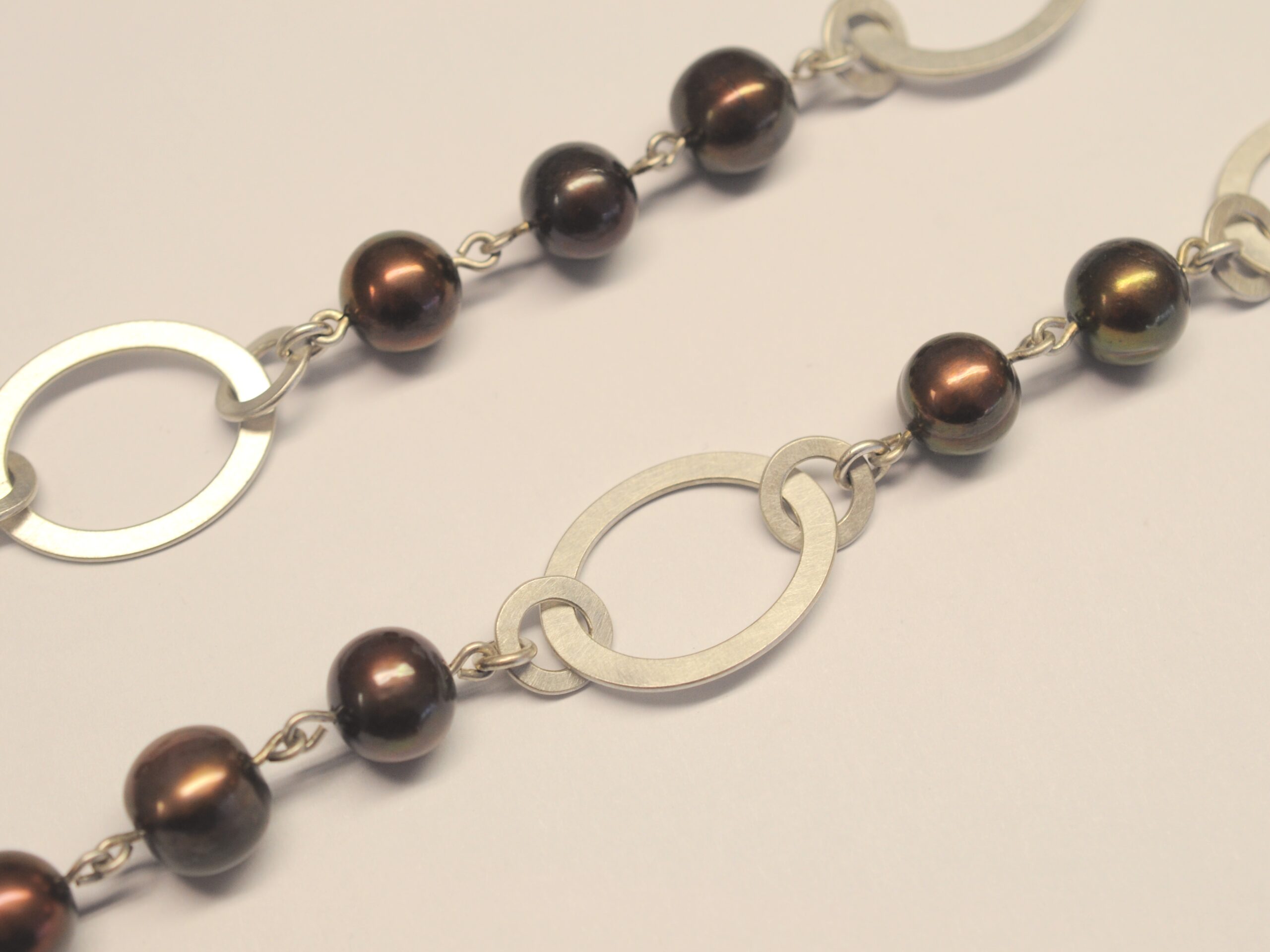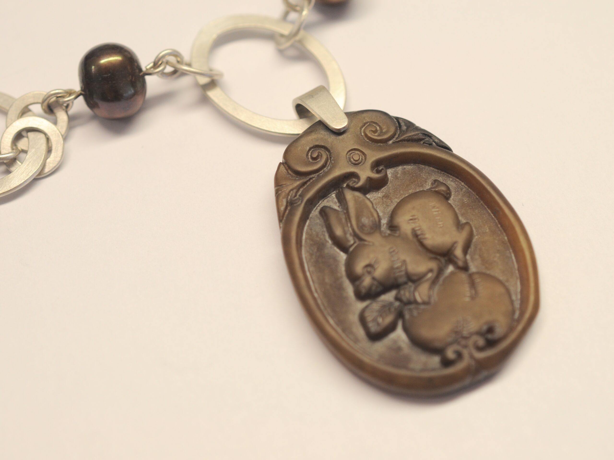 Diese hochwertige hübsche lange Gliederkette habe ich aus 16 ovalen Silberösen, 22 bronzefarben schimmernden Süßwasserzuchtperlen sowie einem braunen Jade Anhänger mit Hasenmotiv gefertigt. Die oval gehämmerten Silberösen haben eine Größe von 27 mm * 21 mm * 1 mm. Eine moderne und stilvolle Damenkette, die hochwertig und abwechslungsreich gestaltet ist. Die Oberfläche der Silberösen ist mattiert und verleiht der Kette eine edle Ausstrahlung. Die Länge der Kette beträgt 90 cm.