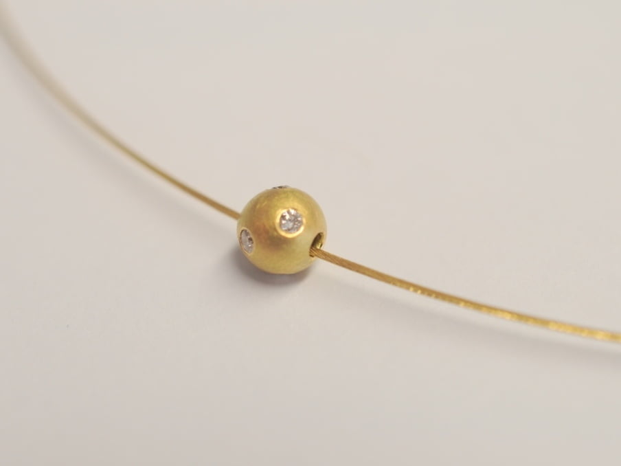 Neues Schmuckset unserer „Sternenhimmel Kollektion“ bei dem eine frei bewegliche Gelbgold-Kugel ein Gelbgold-Seil umkreist. Die Kugel ist aus 750 Gelbgold (18 Karat) gearbeitet und asymmetrisch mit fünf Diamanten im Brillantschliff besetzt. Das feine Goldseil mit einer Stärke von 0,6 mm hat eine Länge von 42 cm und ist mit einem Bajonettverschluss versehen.
